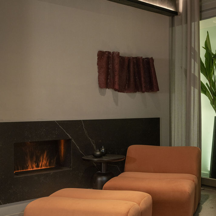 Hacia la derecha el área principal, diseñado con la zona de dormir en el centro, expandiendo al balcón, todo en doble altura combinando planos de madera que se extienden a las paredes superiores y otro central pintado. Desde las paredes perimetrales irradia todo, la biblioteca con área de sillones PALM y mesas SERENA para desayunar, el área de guardado con puertas de abrir traslúcidas bronce, el yoga wall porque es imposible para nosotros no incluir la experiencia wellness, el rincón del hogar con sillón JOSS con posapiés de ultra relax, el área de minibar con pileta y vajilla de diseño de desayuno, el área de escritorio con silloncito NAOMI. En el centro la pared fondo de cama y ventanales en doble altura, cama MANDALA y mesas de luz en nueva versión hotelera LAND STONE.